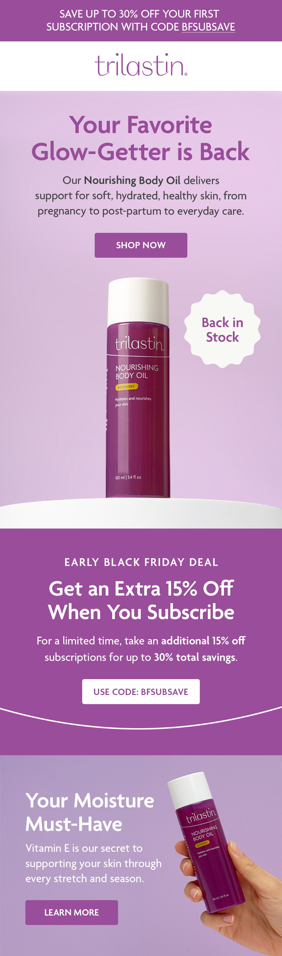 TriLASTIN is a maternity skincare brand known for its stretch mark prevention products. My work included art direction for evergreen and holiday photoshoots, email design, digital advertising, and assests for the launch of a new body oil. These efforts helped modernize the brand’s visual presence and support its continued growth in the DTC space.